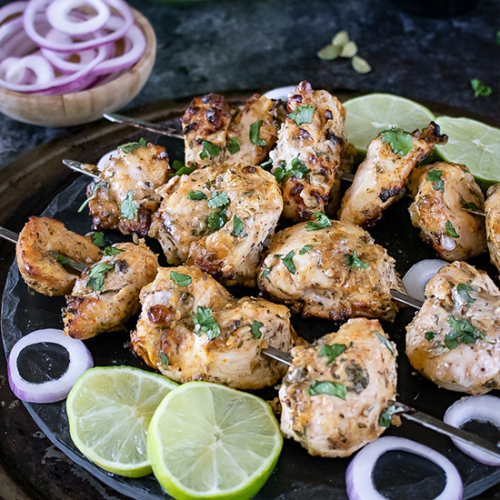 Bone Less Pieces of Chicken Marinated in Yogurt Red Chilli Paste, Lime Juice and Muster Oil and Smoked in Tandoor and Served with Bunch of Salad and Mint Sauce.