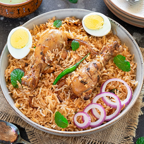 Layers of chicken in yogurt and gravy with basmati rice cooked in masala gravy, flavored with rose petals and itar
